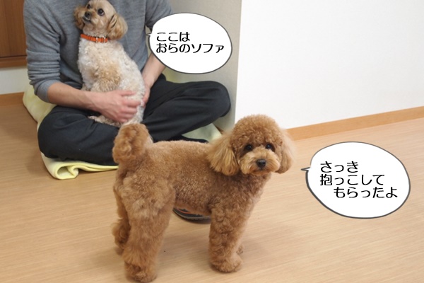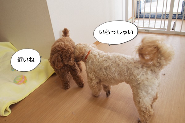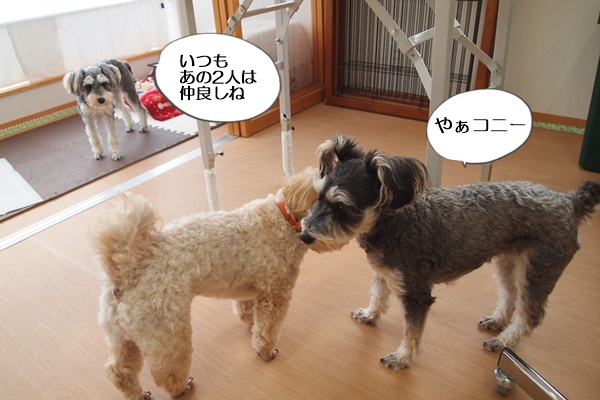 トロちゃん&ウニちゃんの熱烈な歓迎に加え、看板犬コニーもいて、ちょっと押され気味なももちゃん。