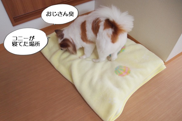 ずっと看板犬コニーが寝ていた毛布に直行するベルちゃん。