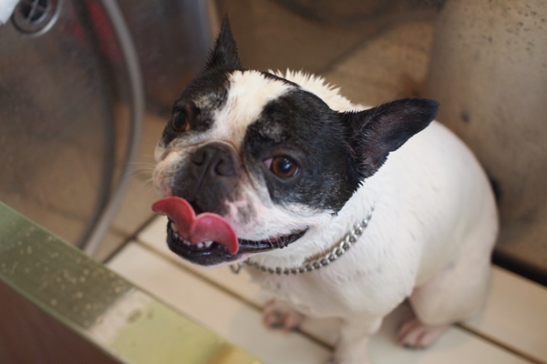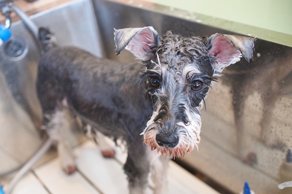 看板犬コニーとお互いにニオイを嗅ぎ合ってから、シャンプースタート。
