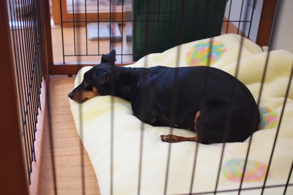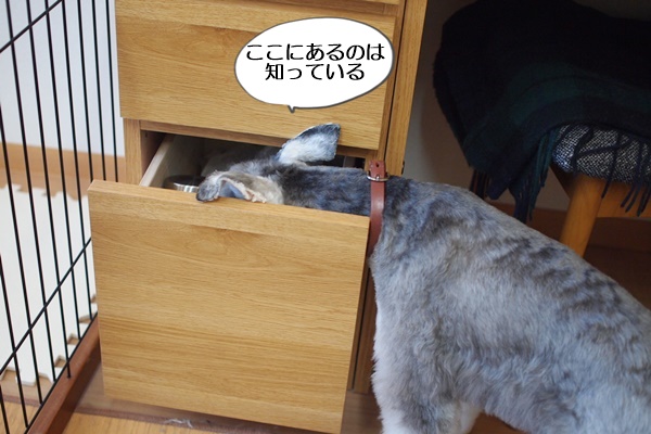 引き出しの前にマットを立てかけたり椅子を置いたり、サークルで妨害してみても突破してくるウィンちゃん。