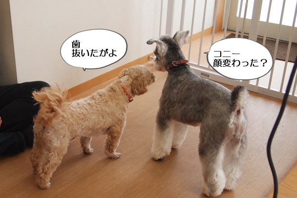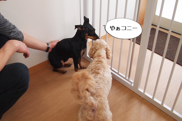 お迎えの時は、2頭とも興奮してしまうので、コニーは奥に連れて行きます。