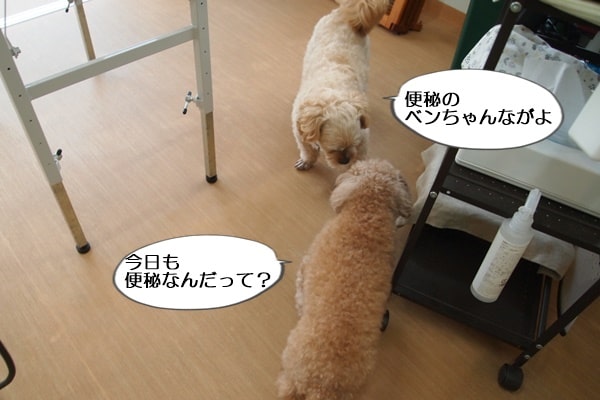 看板犬コニーのことは、あまり得意でないはずなのに、初めだけニオイを嗅ぎに来ていました。