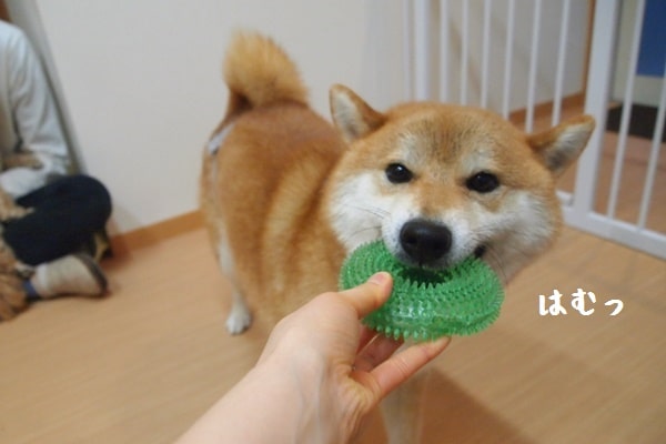 すごく控えめにおもちゃで遊ぶドンちゃん。