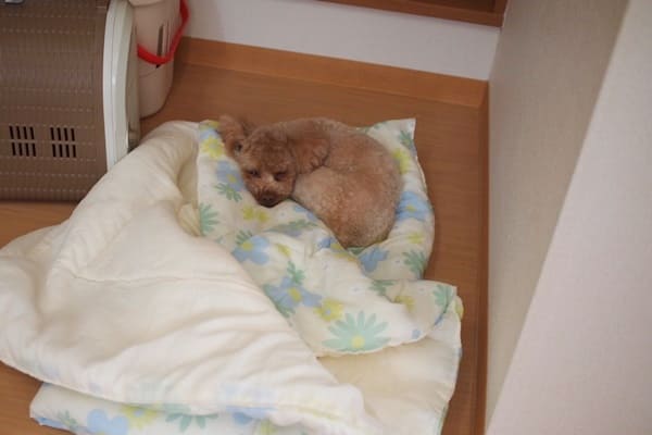 よっぽど疲れたのか、ココちゃんのトリミング中は、布団の上でぐっすり。