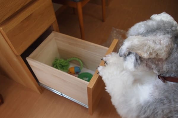 ウィンちゃん、引き出しの前で「開けて」と言ってます。