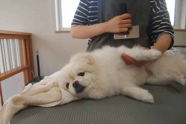 お腹や脇や内ももなどをブローしやすいので、この体勢が可能な子は、寝かせてやるようにしています。