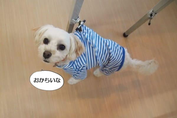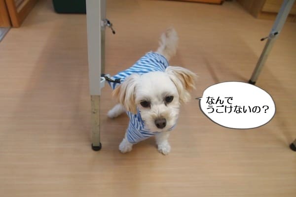 トリミングテーブルの高さを調整する器具が、上手い具合にミラの服のタグに引っ掛かったみたいです。