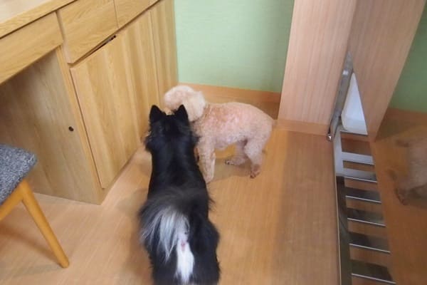 コニーとミラがワンワン言っているのに反応して、「僕も会いたい!」と必死でドアをこすってました。