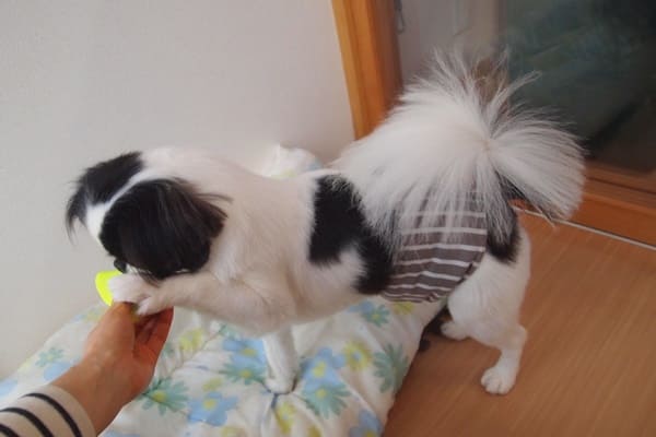 ブローの途中でおもちゃを見つけてしまった獅子丸ちゃん。
