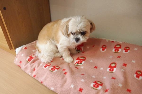 あられちゃんの日は、机の下に布団を敷いてスタンバイしています。