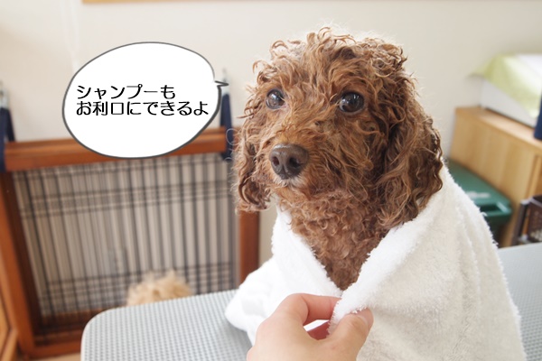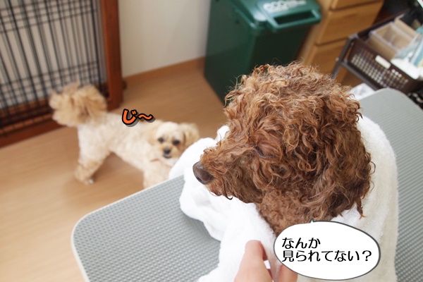 シャンプー中もそわそわ、ブローし始めもそわそわこちらを見ていました。