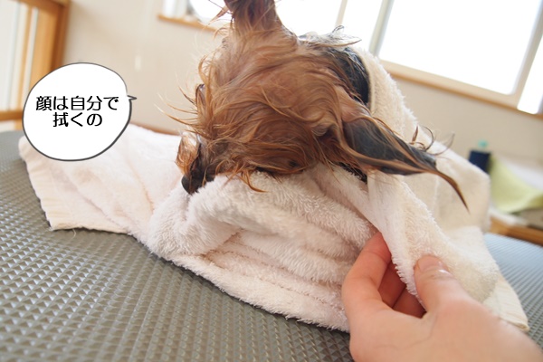 お顔が濡れているのが気になるらしく、自分でタオルに顔をこすりつけてました。