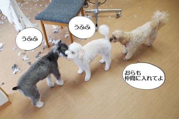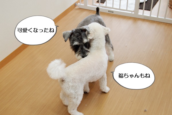 トリミングテーブルから降ろすと、いつもニオイを嗅ぎ合う2人。