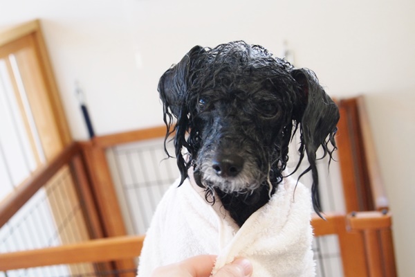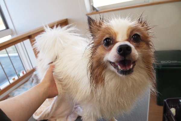 シャンプー後、一生懸命タオルでお顔をゴシゴシ拭いていました。