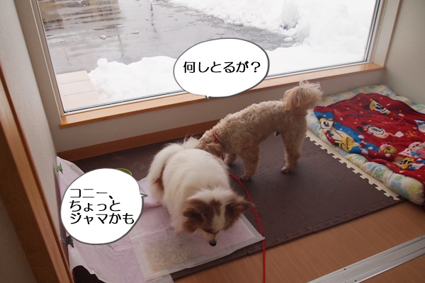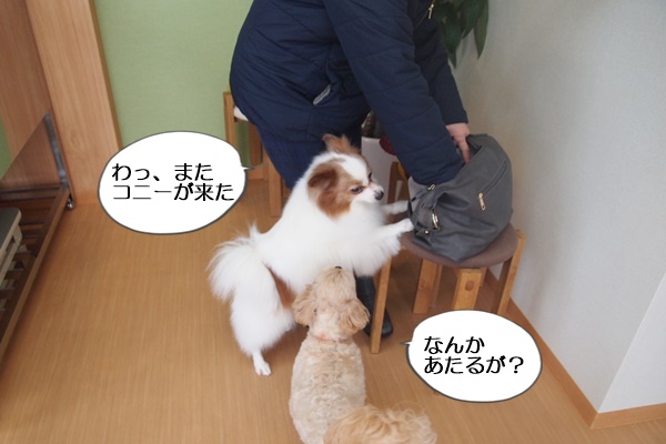 ベルちゃんをテーブルから降ろすと、コニーが近寄ってみたり。