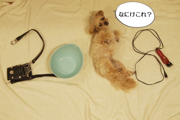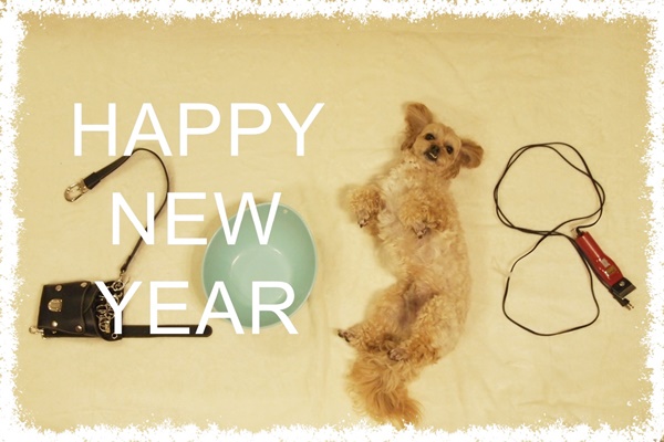 今年の年賀状は、「2018」をシザーケース、風呂桶、愛犬コニー、バリカンで表現してみました。