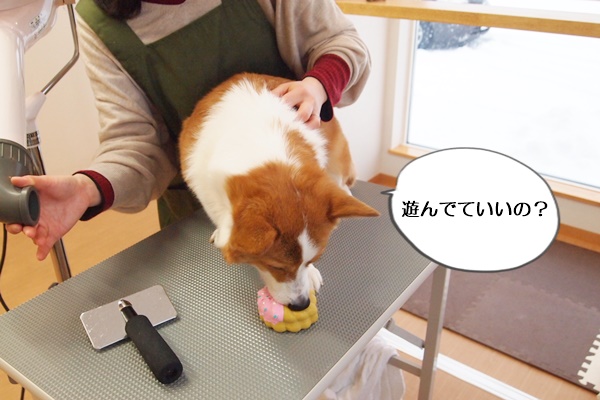 お顔に風が当たるのが苦手なので、おもちゃで気をそらせることに。