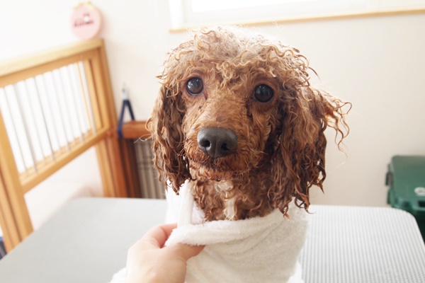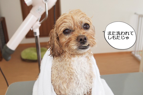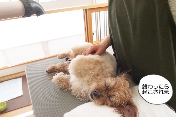 初めの頃は、寝かせてブローするのは嫌がっていたのですが、