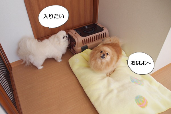 ミックス犬(ペキニーズ×ビションフリーゼ)のまるちゃんと、ポメラニアンのモコちゃんです。