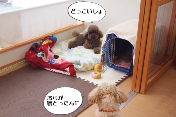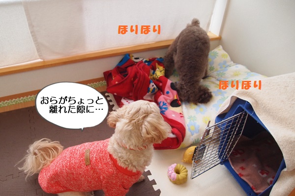 休憩時、看板犬コニーがちょっとお布団から離れた隙に、ぐらちゃんが進出。