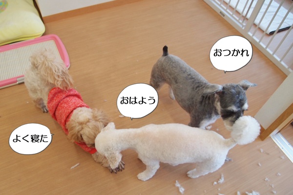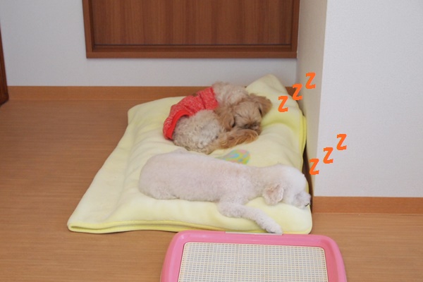 福ちゃんのカット中、ふと目をやると、マハロちゃんとコニーが同じ毛布で寝てました。