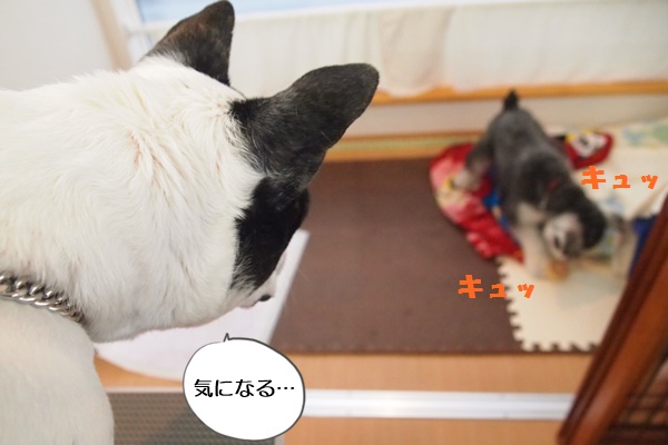 はなちゃんのブロー中、ウィンちゃんがおもちゃで遊び始めました。