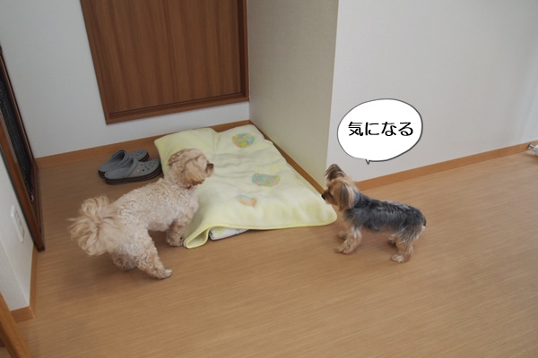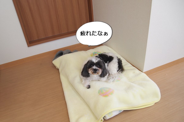 ブロー後の休憩に、トリミングテーブルから降ろすと、毛布に直行。