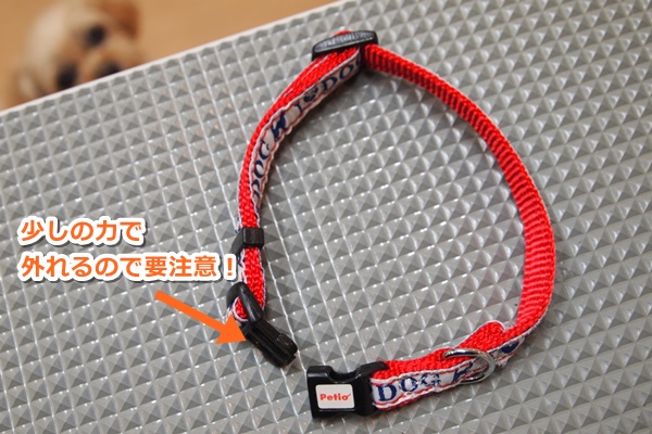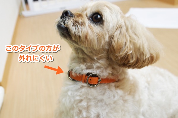 看板犬コニーが付けているタイプの首輪だと、金具が外れにくいです。