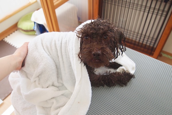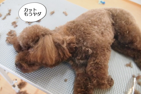 トリミングテーブルから降ろす気配を感じると、むくっと起きてくるコニー。