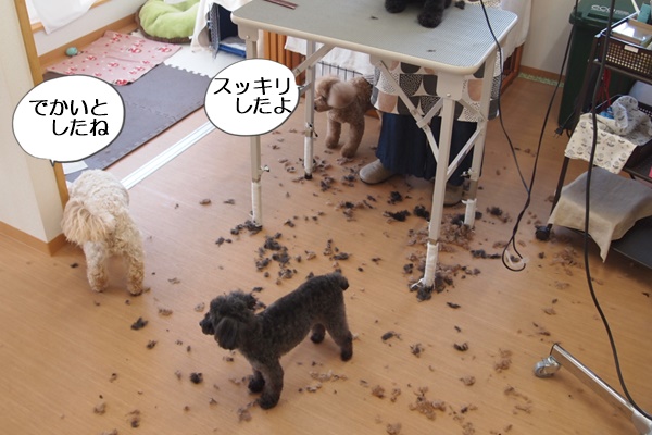 レアンちゃんが終わる頃、2人分の毛が散乱。