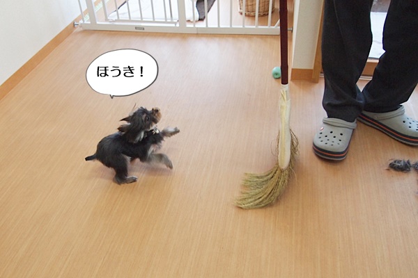 ほうきもおもちゃだと思ったようです。