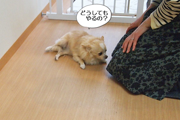 のんちゃんは、シャンプー前の小さな小さな抵抗に、お腹を見せようとします。