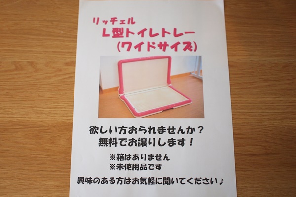 昨日お知らせしていた「トイレトレー譲ります」の件ですが、早速お知らせのポップを作りました。
