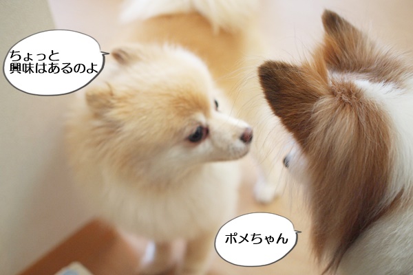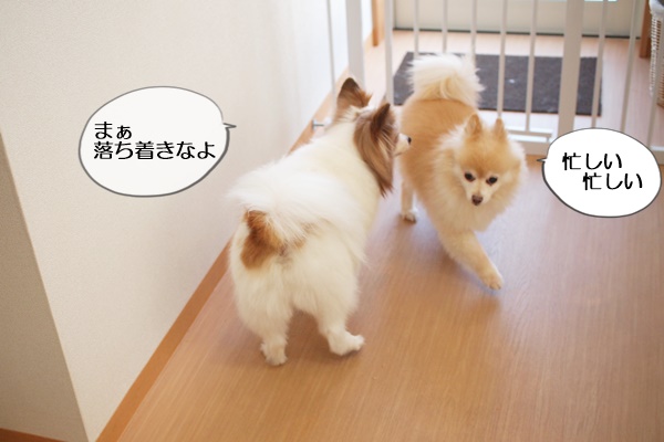 ベルちゃんがどっしりと構えて、ポメちゃんがうろうろ。