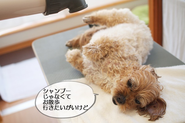 「シャンプーじゃなくて、散歩に連れて行け」と目で訴えられるのですが、この暑さはムリムリ。