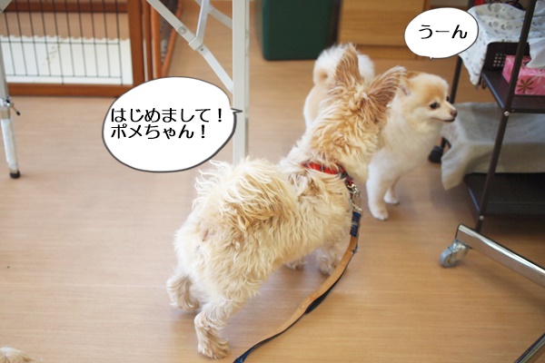 ラックちゃん、コニーには逃げ腰ですが、ポメちゃんには強気です。