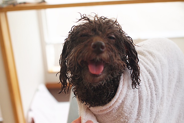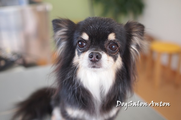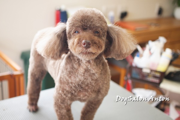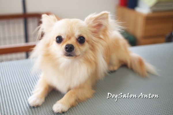 基本的にモコちゃんは、トリミングテーブルの上では目がしょぼしょぼです。