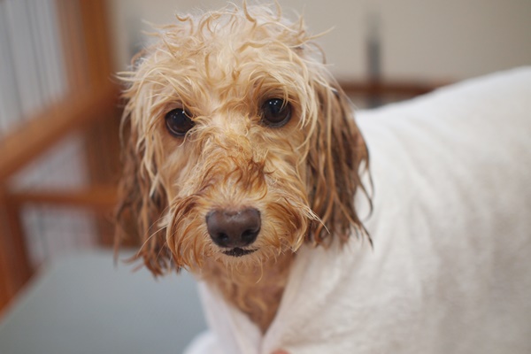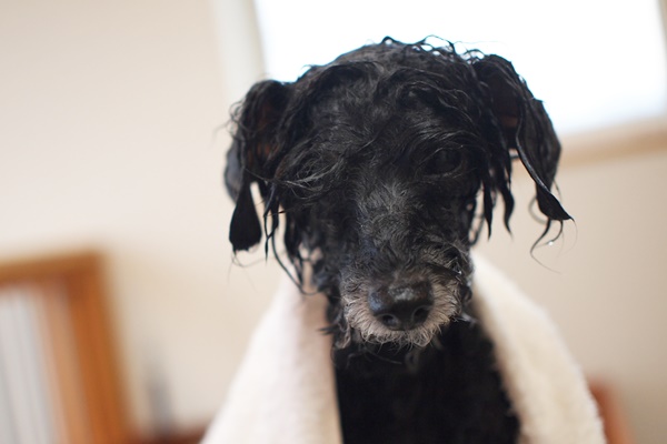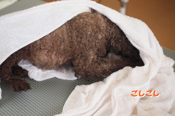 シャンプー後にタオルで激しくごしごしする萌華ちゃん。