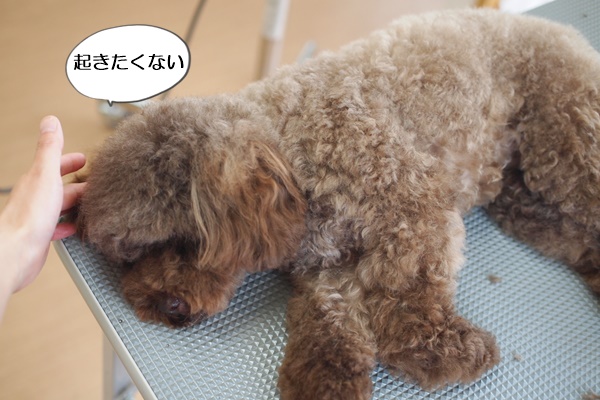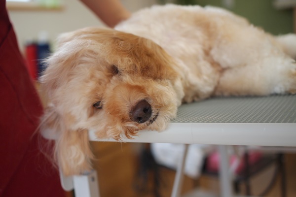 トリミングテーブル上では寝ていて、床の上では起きている。