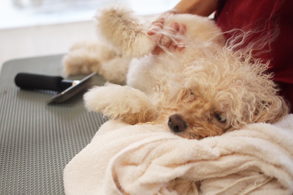 この方が、わんちゃんも楽で、毛をときやすいんですよね。