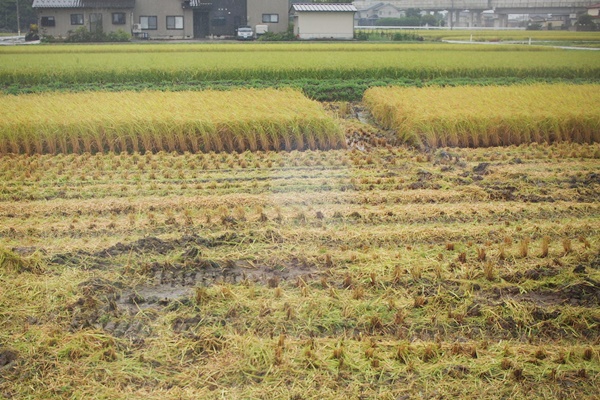 稲を刈る機械であるコンバインが、田んぼの角の方まで刈れないから、角だけ手で刈っているのかと推察。