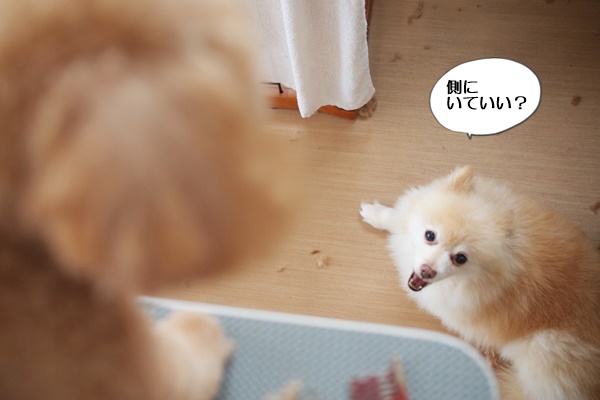 ポメちゃんのシャンプーブローの時は、ココちゃんが側に。