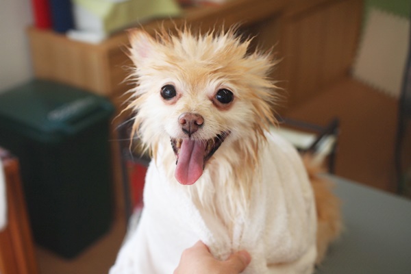 床の上では落ち着きないポメちゃんですが、シンクの中も、トリミングテーブルの上でも、お利口さんに頑張ってくれます。
