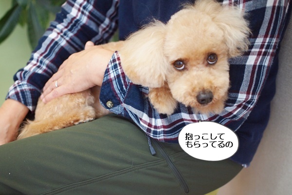 次のわんちゃん、トイプードルのまろんちゃんが早めに来店しましたが、モコちゃんはその飼い主さんに甘えまくっていました。