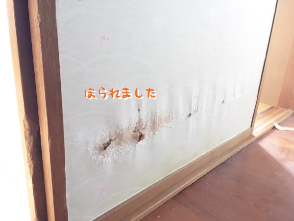 上の写真は、私が張り直したのに再びビリビリにした痕跡です。