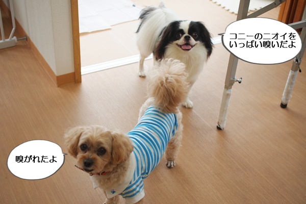 獅子丸ちゃんは、お店の探検を終えると、コニーの顔周りを嗅ぎ始め、ついには飛び出た下あごを入念に嗅いでいました(笑)。