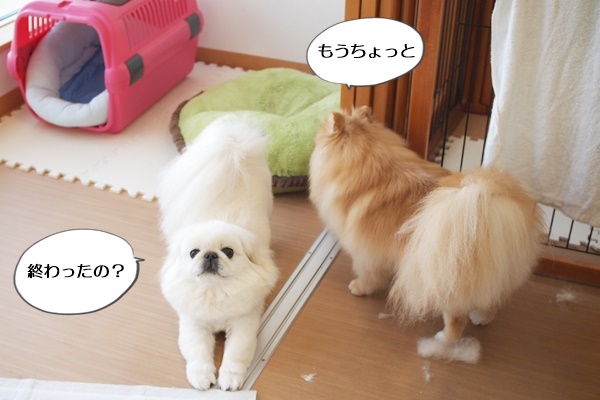 まずは、ミックス犬(ペキニーズ×ビションフリーゼ)のまるちゃんと、ポメラニアンのモコちゃんです。