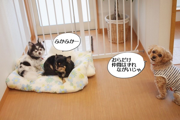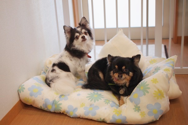 外を見たいライトちゃんと、布団に座りたいヤマトちゃん。