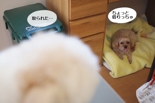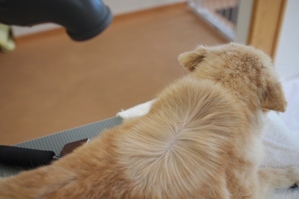 ブロー中のあられちゃんは、コニーが毛布の上にいるのを見てハッとしてました。
