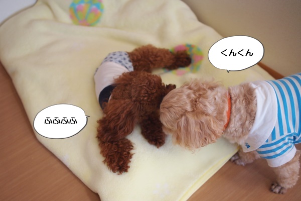 コニーが嗅ぎに行って、そらちゃんがお腹を見せる、という繰り返し。